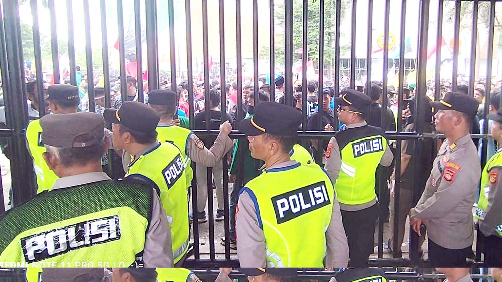 Aksi demonstrasi ribuan mahasiswa dari berbagai perguruan tinggi di Palembang berlangsung di Gedung DPRD Sumatera Selatan (Sumsel), Senin (1/9). Para mahasiswa akhirnya berhasil masuk ke halaman gedung wakil rakyat tersebut. Keberhasilan massa mahasiswa memasuki halaman DPRD Sumsel menjadi puncak dari rangkaian aksi yang sejak awal mendapat penjagaan ketat aparat. Ribuan mahasiswa yang hadir kompak menyuarakan aspirasi mereka, meski sempat terjadi ketegangan sebelum akhirnya diberikan akses masuk ke dalam area gedung. (Salamun/Radar Palembang)