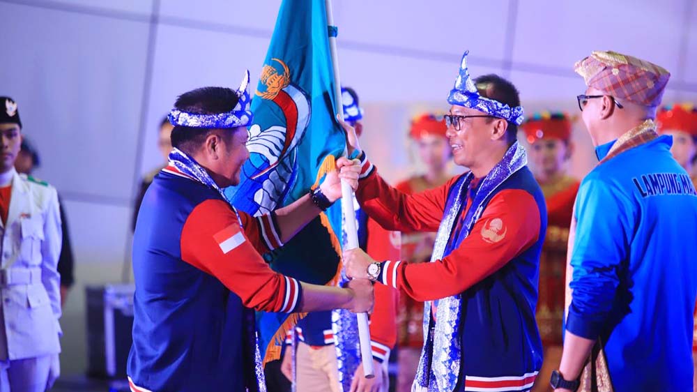 Gubernur Lampung, Rahmat Mirzani Djausal, yang hadir bersama Forkopimda lainnya, secara resmi menerima tongkat estafet dan menyatakan kesiapan daerahnya untuk menjadi tuan rumah Pornas Korpri berikutnya pada Tahun 2027. (swa)