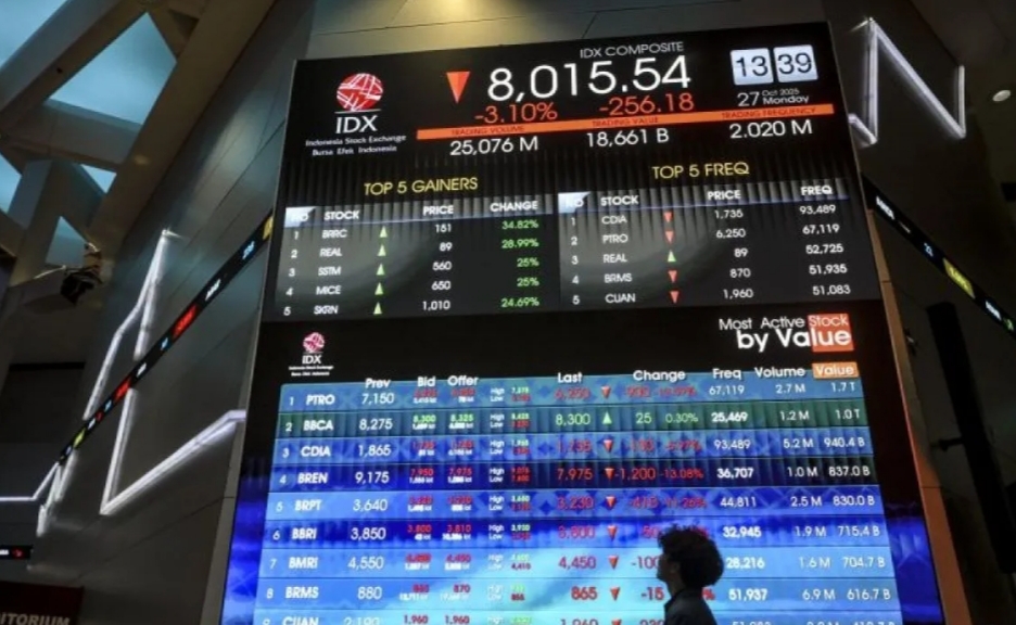 Ilustrasi : pergerakan harga saham di Bursa Efek Indonesia, Jakarta, Senin (27/10/2025). Indeks Harga Saham Gabungan (IHSG) pada Senin (27/10) ditutup melemah 154,57 poin atau 1,87 persen ke level 8.117,15.--