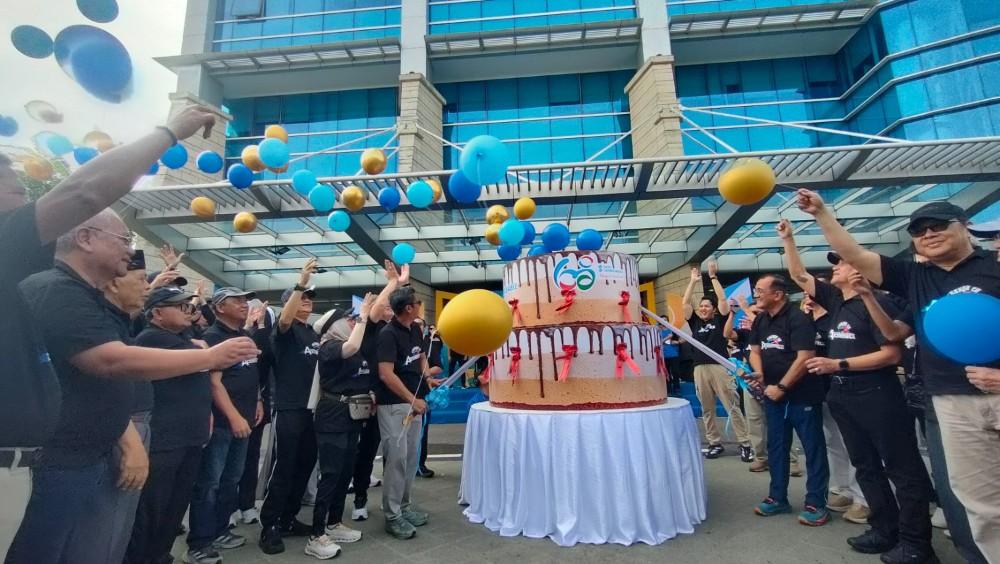 Puncak HUT ke-68 Bank Sumsel Babel Simbolis di tandai pemotongan kue di halaman Kantor Pusat BSB Jakabaring oleh PPS Direktur Utama Bank Sumsel Babel, Festero Mohamad Papeko-Salamun/Radar Palembang -