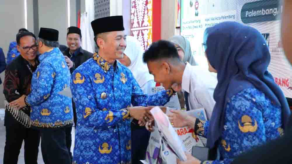 Walikota Palembang H Ratu Dewa memberikan ucapan selamat kepada Adyan, pelajardari SMPN 3 sebagai juara 2 didampingi Kepsek Nofrita, pada Senin 17 Nopember 2025--